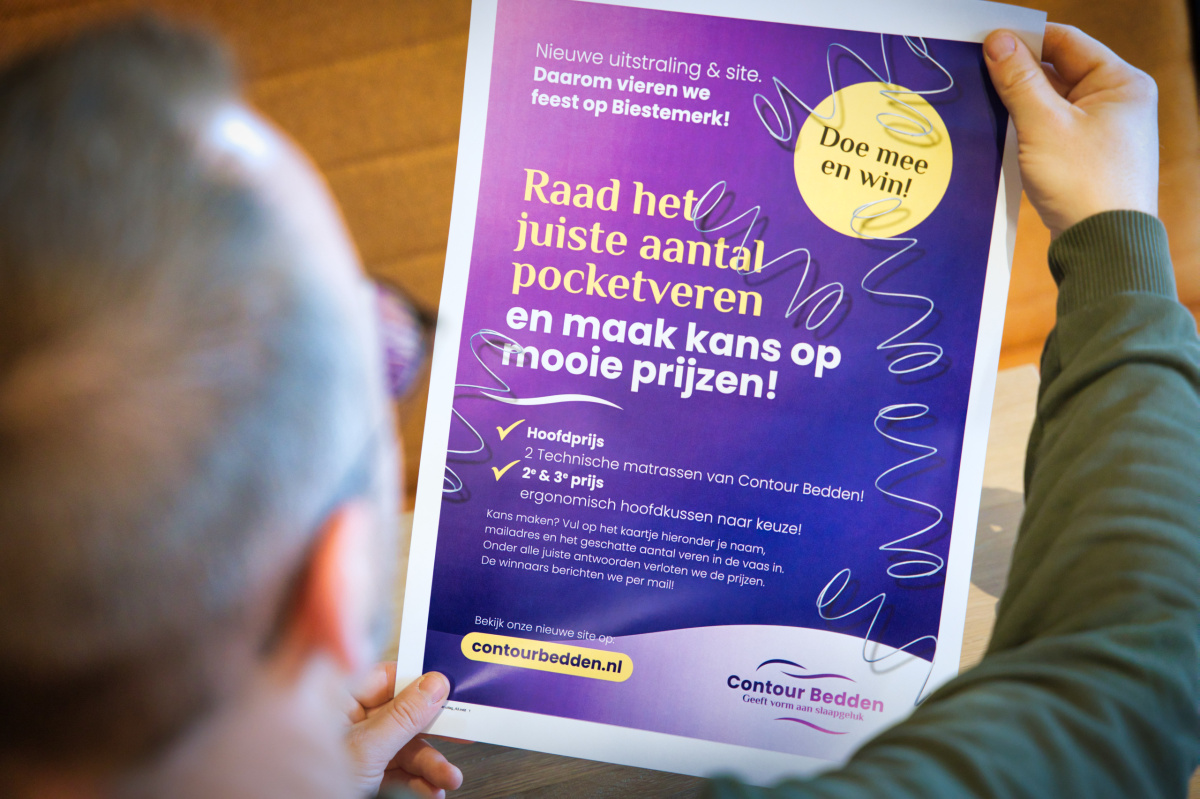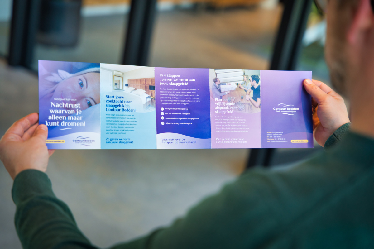 Ook realiseerden we een makkelijk mee te nemen flyer, waarin de meerwaarde van Contour Bedden naar voren komt. En schreven een persbericht en socials, die hij zelf kon versturen en plaatsen.