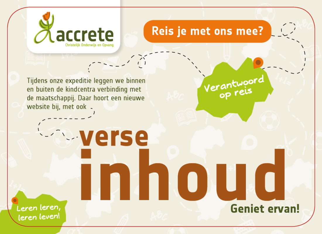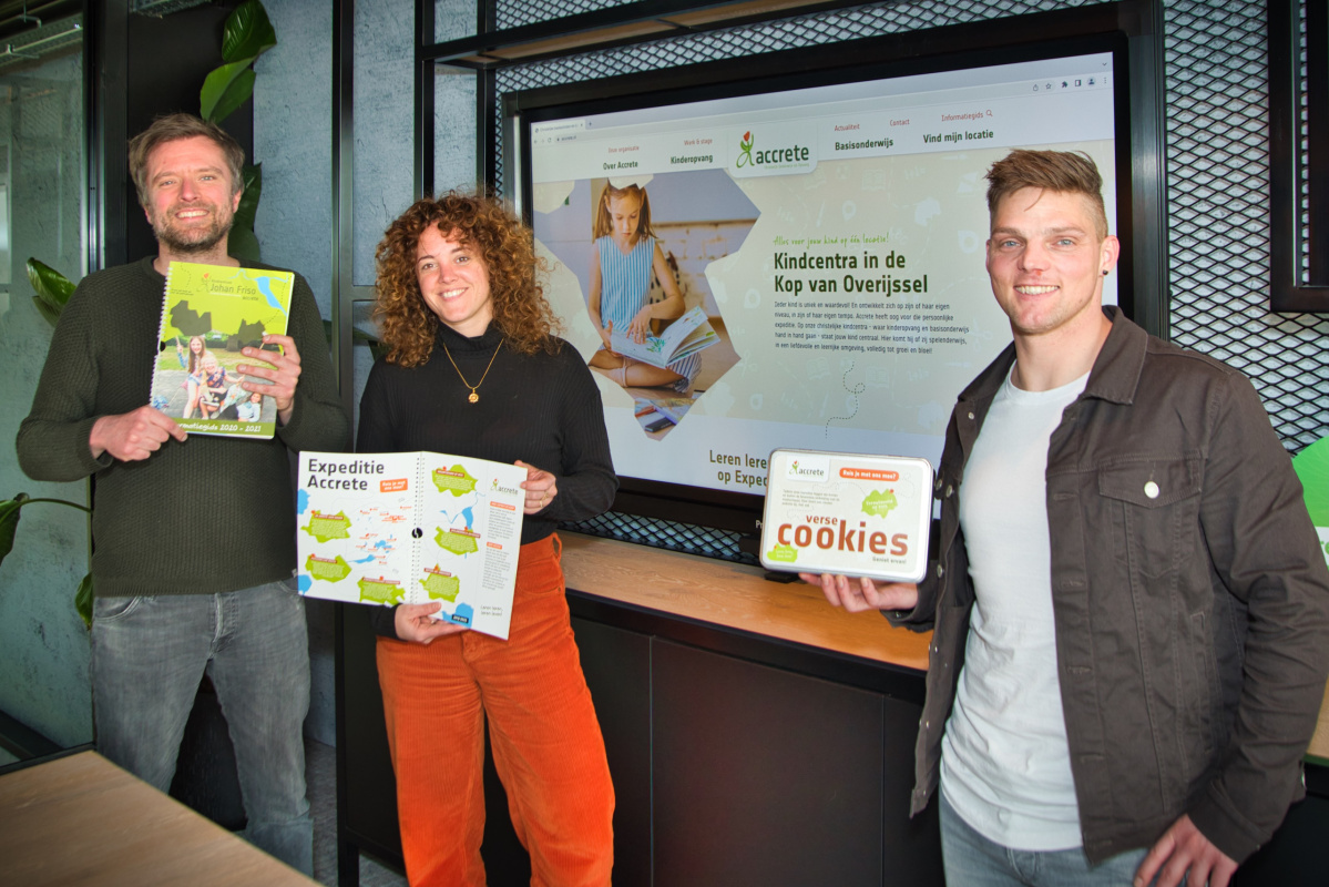 Al jarenlang hebben we een erg prettige samenwerking met Accrete. Nadat we al tal van digitale en fysieke communicatiemiddelen voor ze maakten, wilde deze aanbieder van kinderopvang en basisonderwijs graag zijn website vernieuwen. En daarnaast die van zijn 16 locaties in gemeenten Steenwijkerland en Zwartewaterland. Een prachtige opdracht, waar we vol energie mee aan de slag gingen!