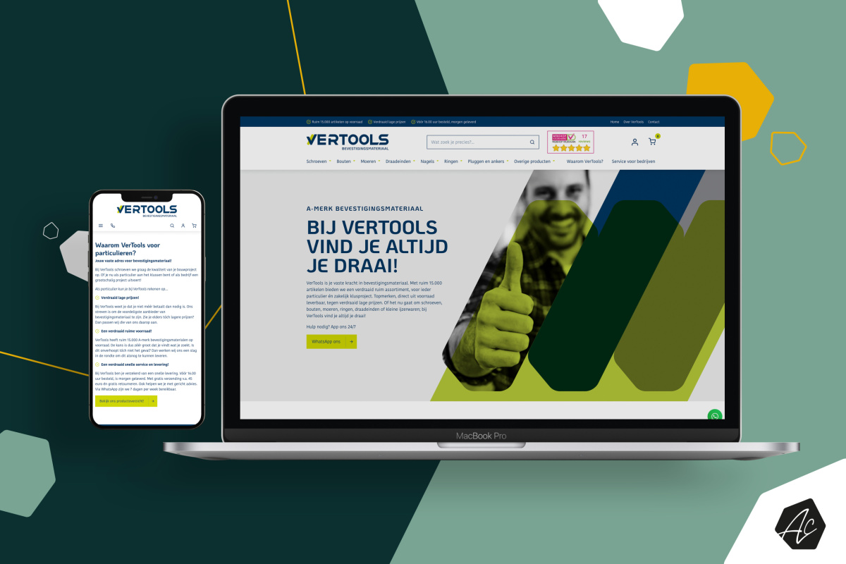 Al een aantal jaren runt Kay zijn webshop VerTools. Met ruim 15.000 artikelen biedt hij een ruim assortiment aan bevestigingsmateriaal, voor ieder particulier en zakelijk klusproject. Kay wilde zijn bedrijf echter naar een hoger plan tillen. Wij hielpen hem daar graag bij, o.a. met een nieuwe merkidentiteit!